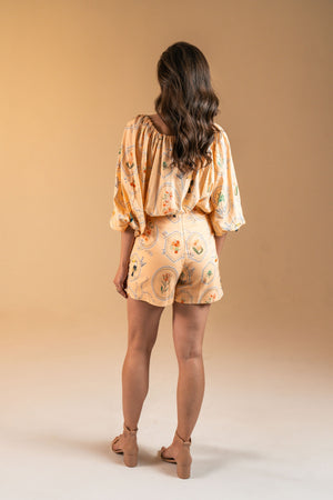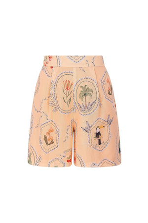Eleve seu guarda-roupa de verão com este short de linho de cintura alta com uma estampa tropical romântica e encantadora. Feito de tecido natural e adornado com uma estampa tropical romântica, este short é forrado para maior conforto e exala feminilidade. Uma peça versátil e indispensável para qualquer look casual ou romântico.