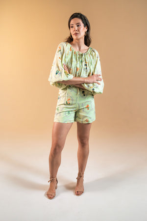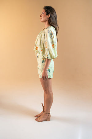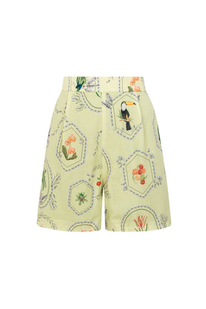 Eleve seu guarda-roupa de verão com este short de linho de cintura alta com uma estampa tropical romântica e encantadora. Feito de tecido natural e adornado com uma estampa tropical romântica, este short é forrado para maior conforto e exala feminilidade. Uma peça versátil e indispensável para qualquer look casual ou romântico.