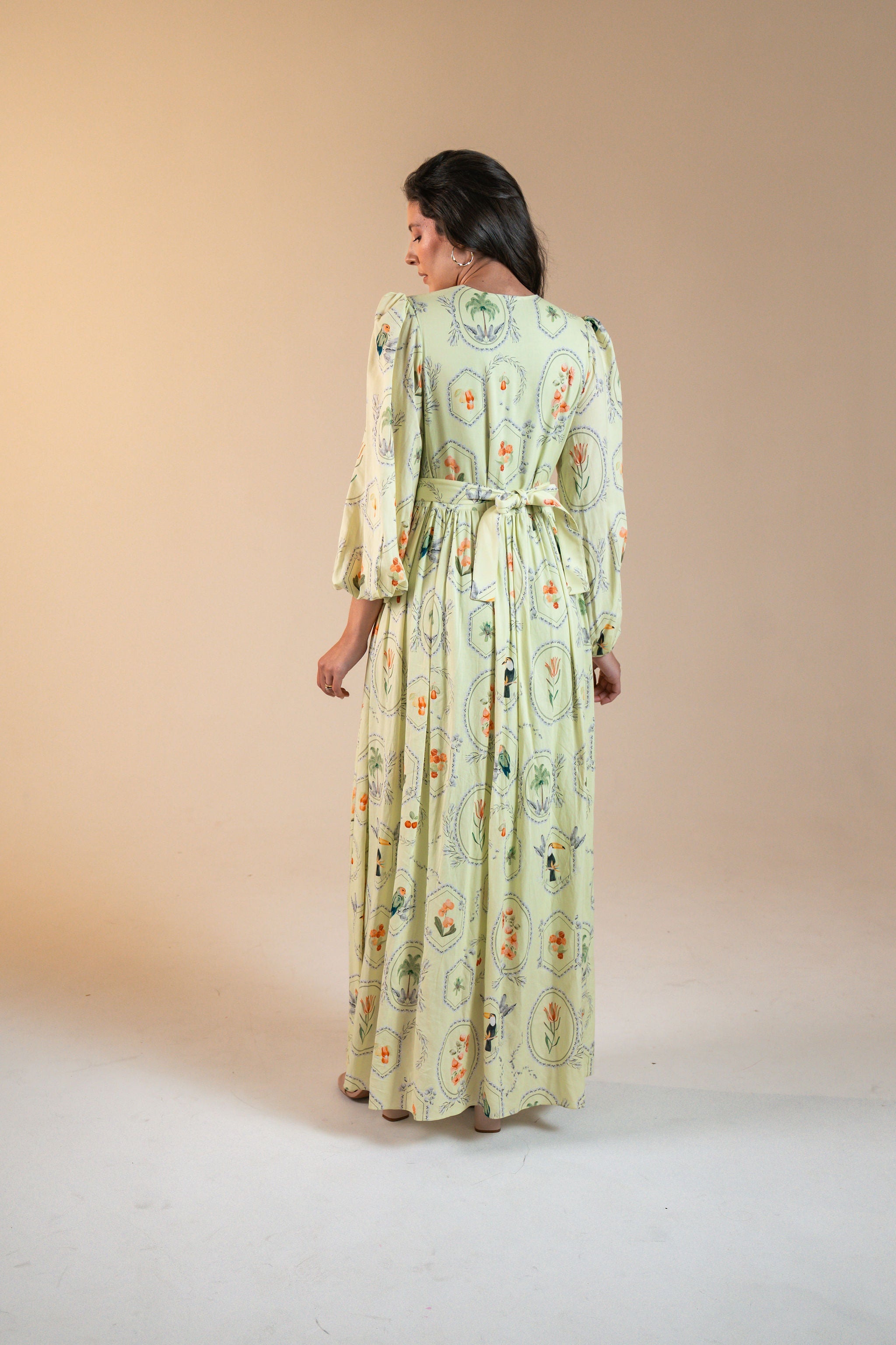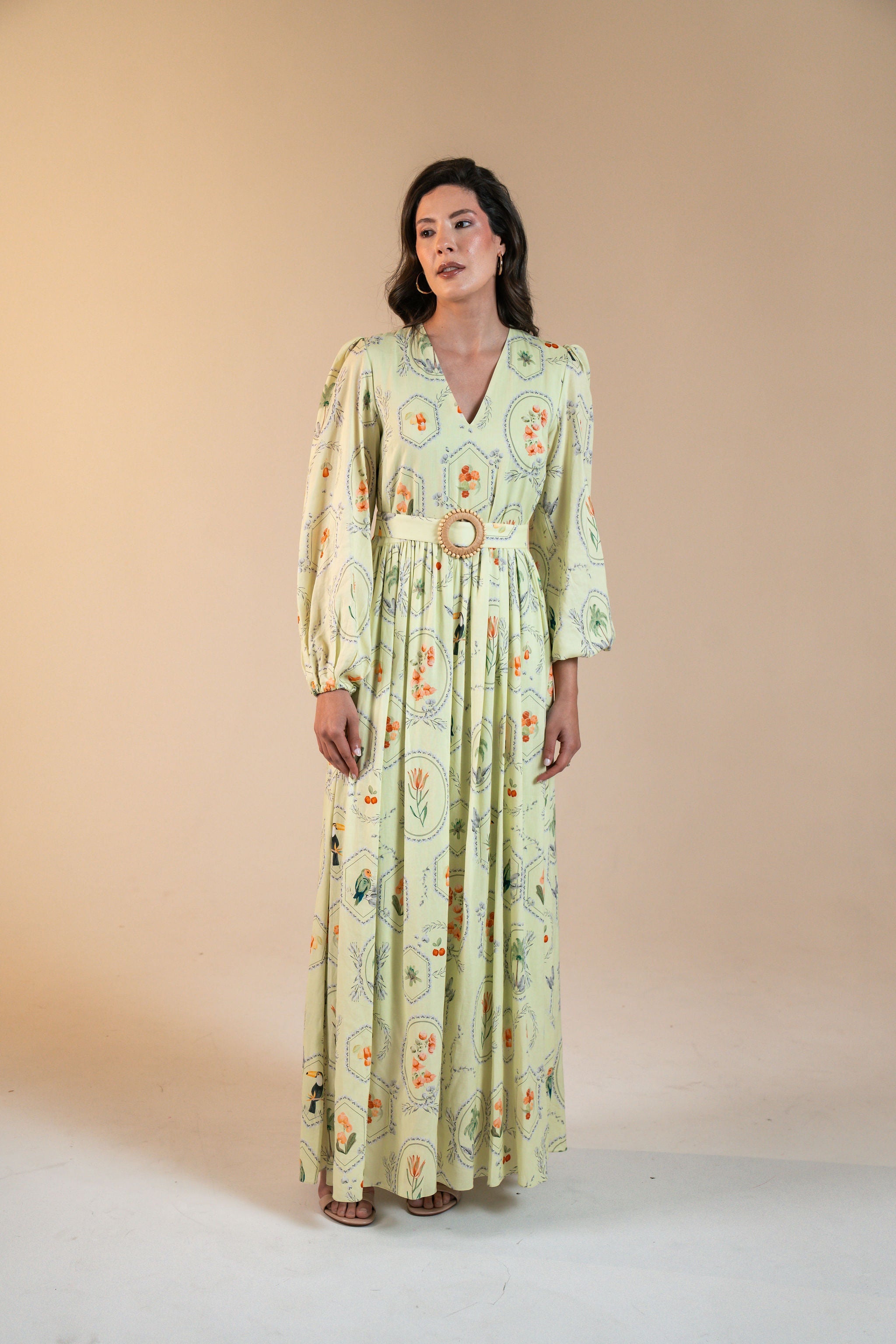 Prepare-se para uma escapada romântica e tropical com o vestido maxi Marcela. Este vestido maxi apresenta um decote em V lisonjeiro e uma saia fluida. A delicada estampa tropical adiciona um toque de paraíso, enquanto o fundo pastel suave nas opções pêssego, menta ou amarelo manteiga fará você brilhar. O cinto de argola de ráfia é removível para maior versatilidade.