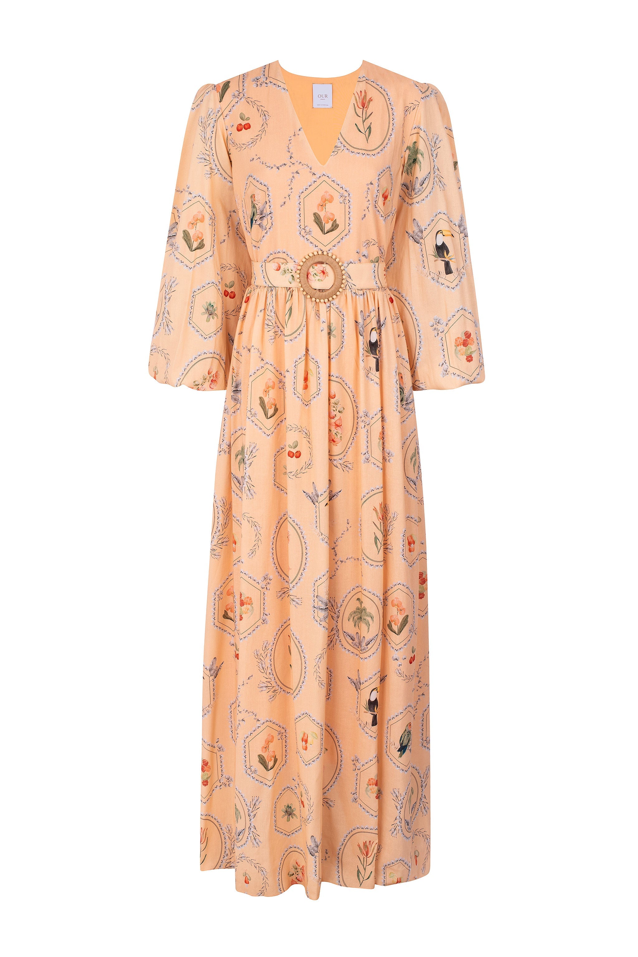 Prepare-se para uma escapada romântica e tropical com o vestido maxi Marcela. Este vestido maxi apresenta um decote em V lisonjeiro e uma saia evasê fluida. A delicada estampa tropical adiciona um toque de paraíso, enquanto o fundo pastel suave nas opções pêssego, menta ou amarelo manteiga fará você brilhar. O cinto de argola de ráfia é removível para maior versatilidade.