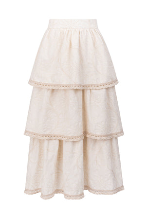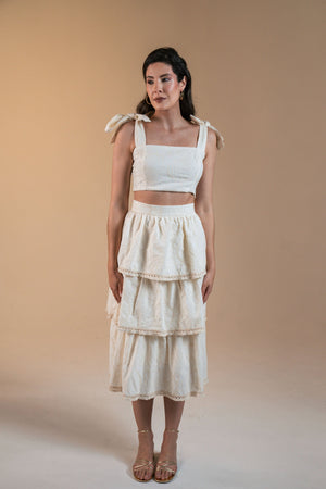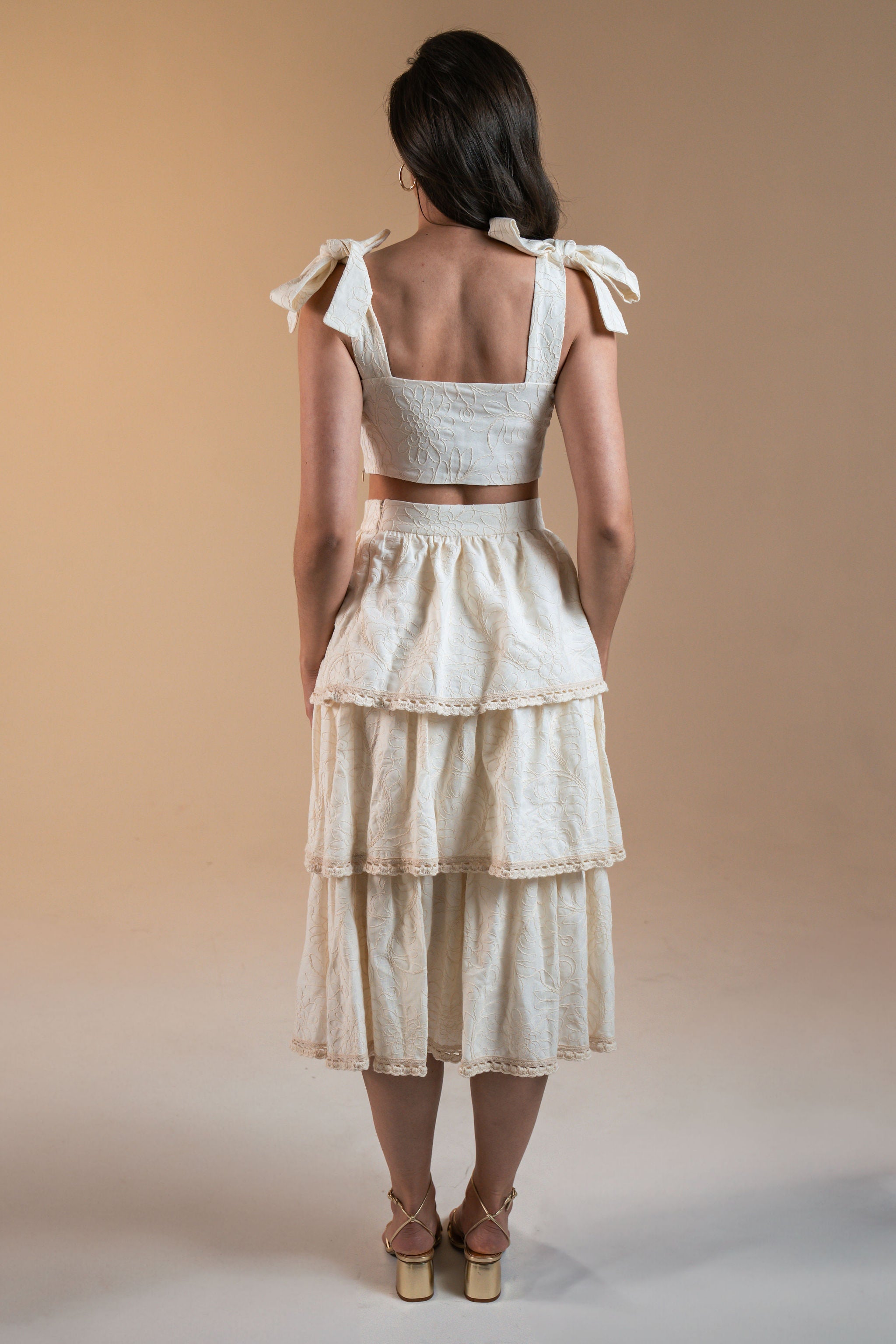 Eleve seu guarda-roupa com nosso design best-seller Ruffle Boho Midi Skirt em bege baunilha. O design em camadas exala feminilidade com seu estilo romântico e charmosos enfeites de crochê. Complete o look perfeito com o top cropped com laço combinando.