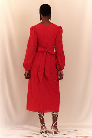Entregue-se ao luxo com nosso VESTIDO MARCELA BRODERIE ANGLAISE em vermelho deslumbrante. Feito de algodão bordado de forma intrincada, ele apresenta um cinto versátil para várias opções de amarração e uma fivela refinada em ráfia. Totalmente forrado e finalizado com detalhes de alta costura requintados, este vestido exala sofisticação a cada passo.