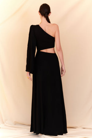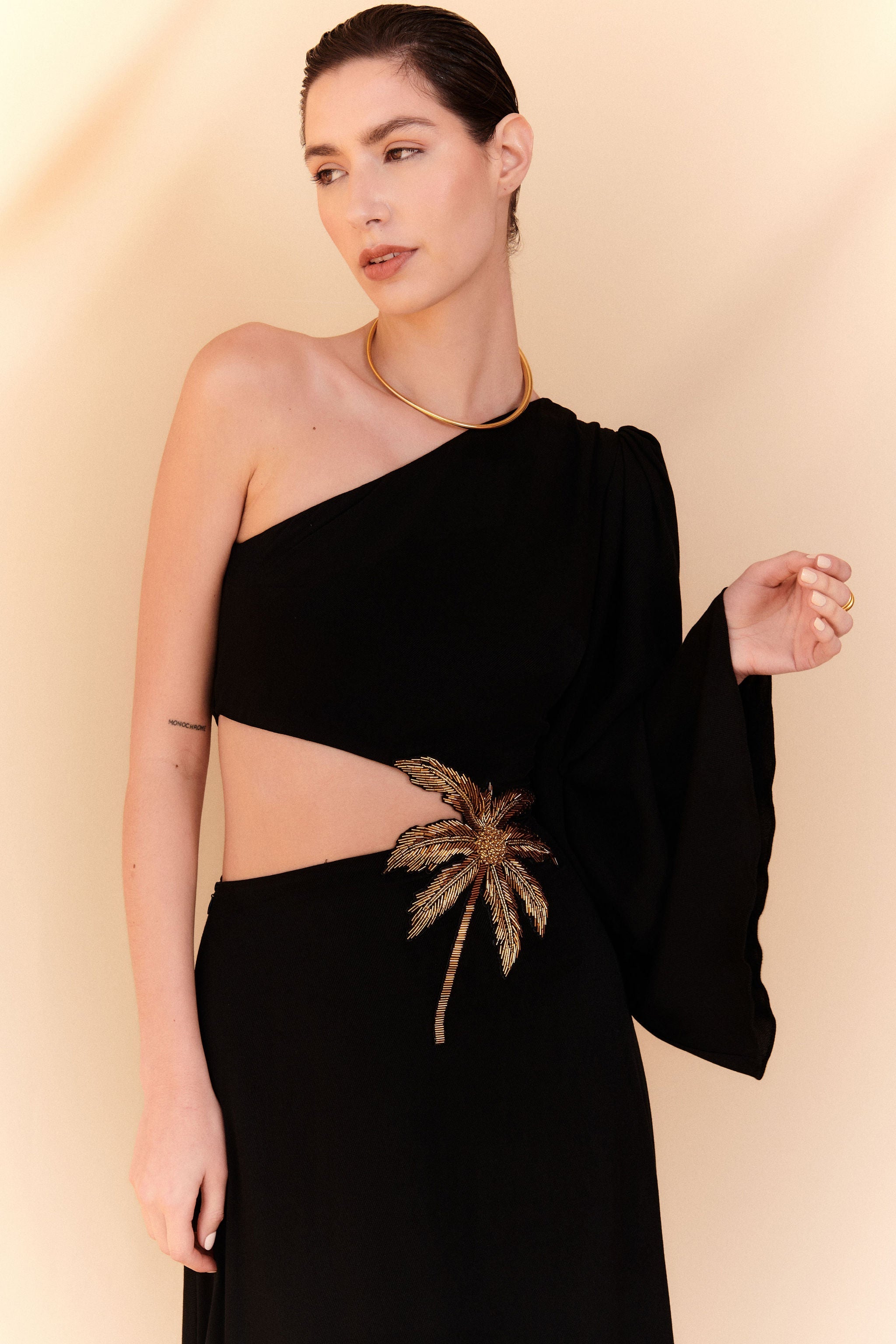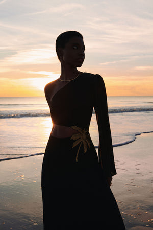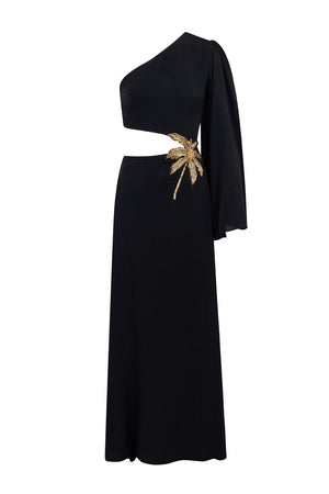 Apresentando nosso deslumbrante e exclusivo vestido preto Cut Out Maxi. Esta peça premium ostenta bordados intrincados de palmeiras, embelezados com contas douradas brilhantes e recortes estrategicamente posicionados para um toque sensual. Eleve seu estilo com este vestido luxuoso e sofisticado.