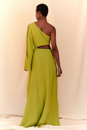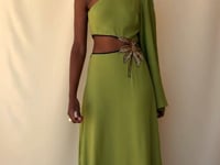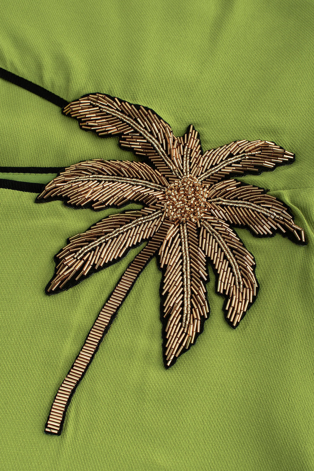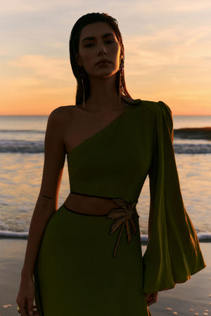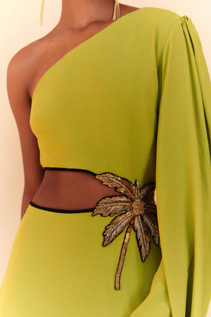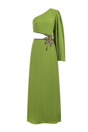Apresentando nosso deslumbrante e exclusivo vestido longo verde Cut Out. Esta peça premium ostenta bordados intrincados de palmeiras, embelezados com contas douradas brilhantes e recortes estrategicamente posicionados para um toque sensual. Eleve seu estilo com este vestido luxuoso e sofisticado.