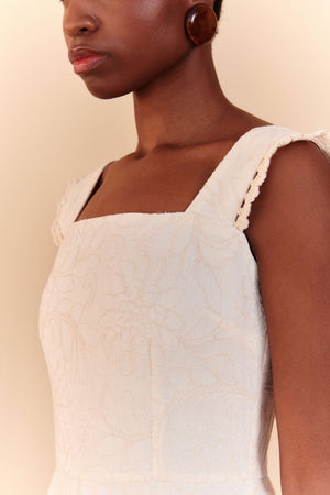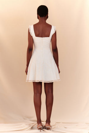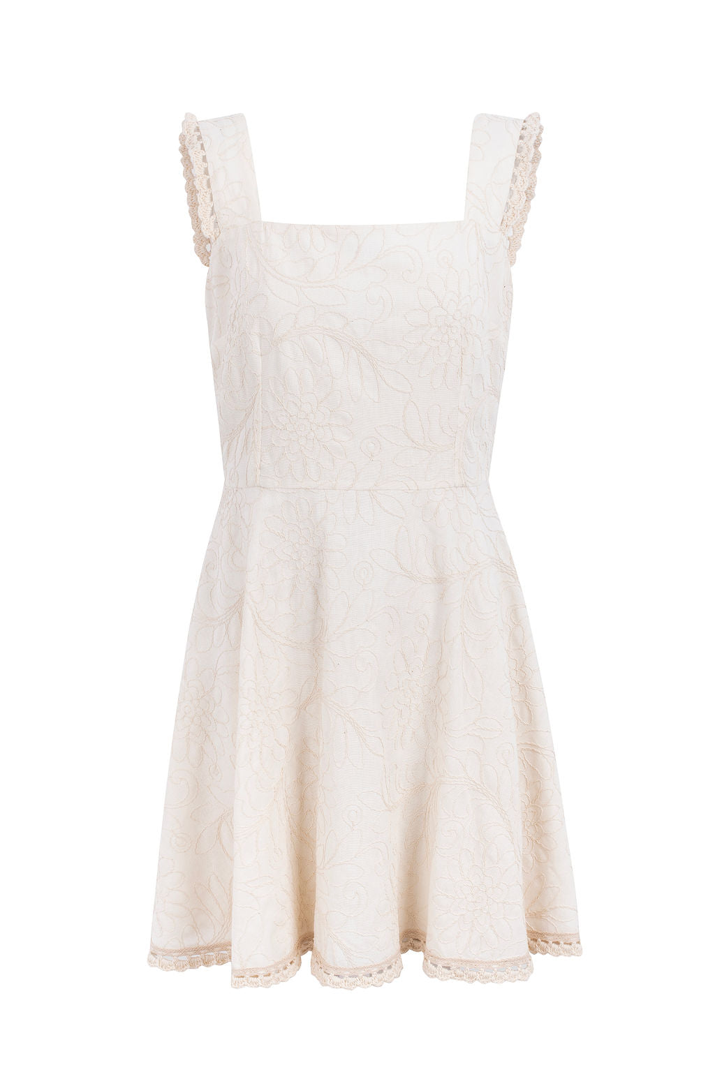 Entregue-se à elegância romântica do nosso vestido mini em bordado inglês. Feito de uma mistura luxuosa de linho e viscose, este vestido apresenta delicados bordados de flores de algodão e acabamentos em crochê. Com costuras francesas e forro completo, este vestido exala sofisticação e charme.