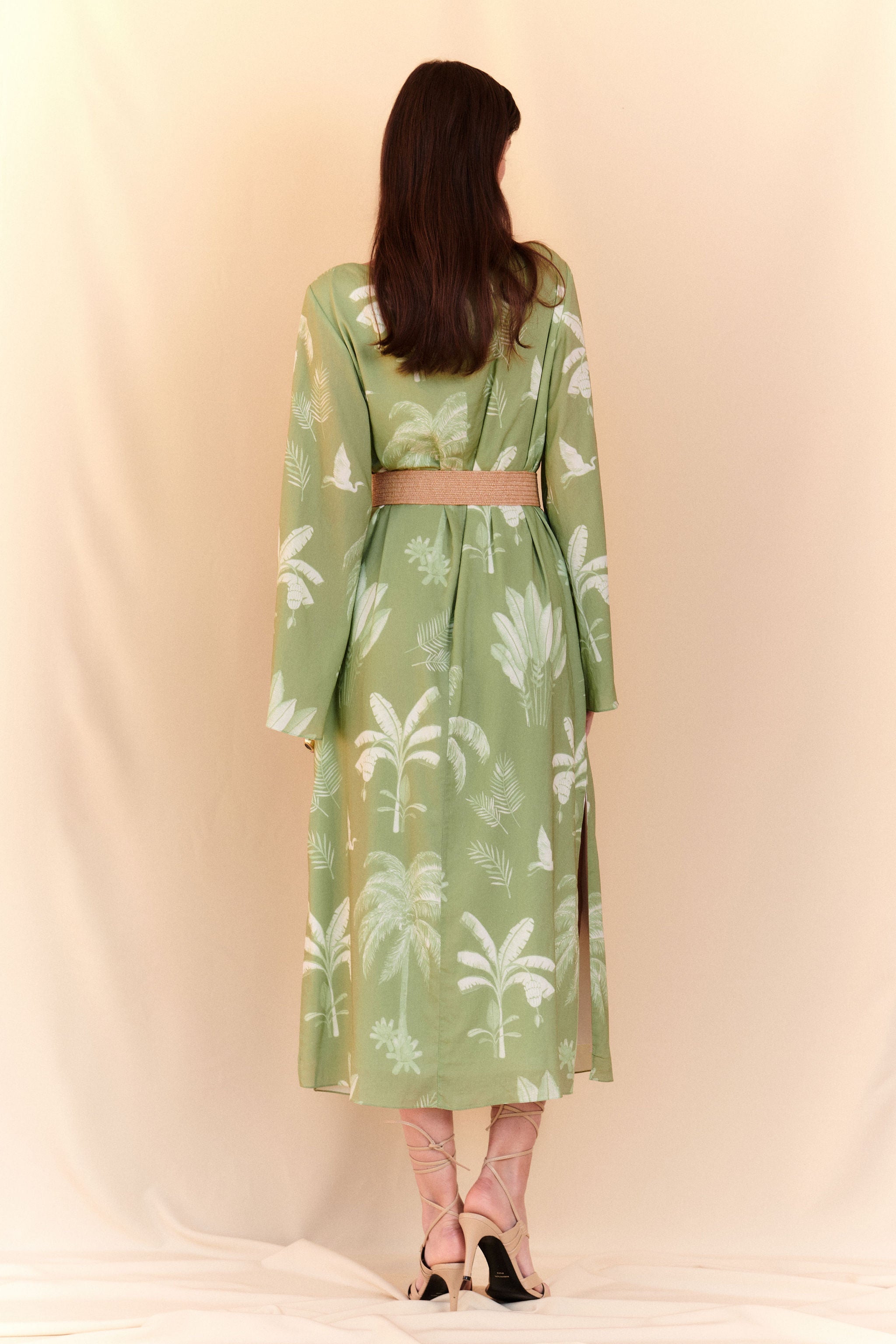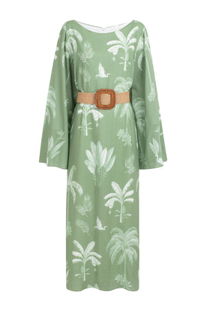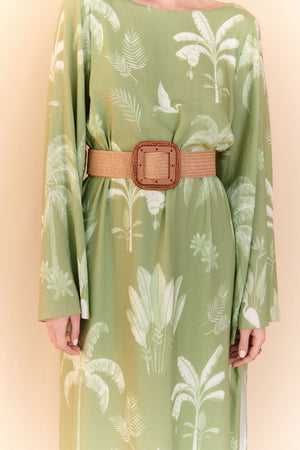 Feito de linho fresco leve e viscose, este vestido apresenta uma estampa tropical que vai transportar você para o paraíso. Complete o look com o cinto de ráfia incluso para um toque extra de elegância. Perfeito para ficar fresco e estiloso em dias quentes de verão.